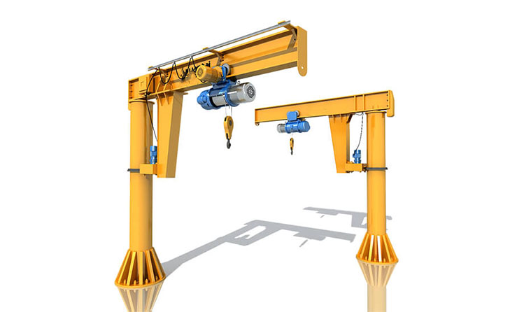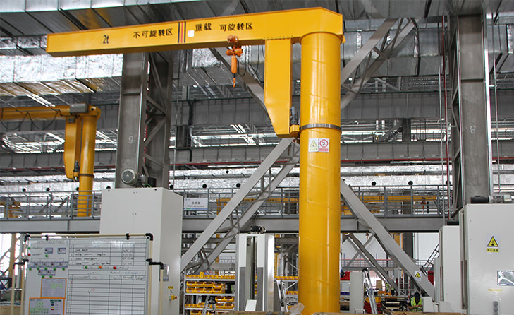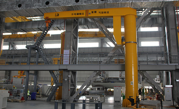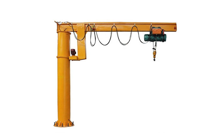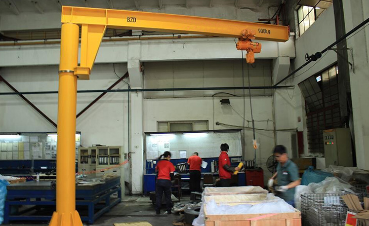 Pillar Jib Crane is widely used in machining workshop, product storage and dispatch warehouse, plastic injection molds changing, finished steel product industries, especially in the production lines, column mounted jib crane a type of crane that uses a mounted arm to lift, move and lower material. The jib crane installed and fixed on ground. The arm, mounted either perpendicular to or an acute angle upwards from a column(pillar), may rotate along its central axis through a limited arc or a full circle. This kind of jib crane is composed by column, beam, rotation structure , electric hoist and fixing parts, etc.